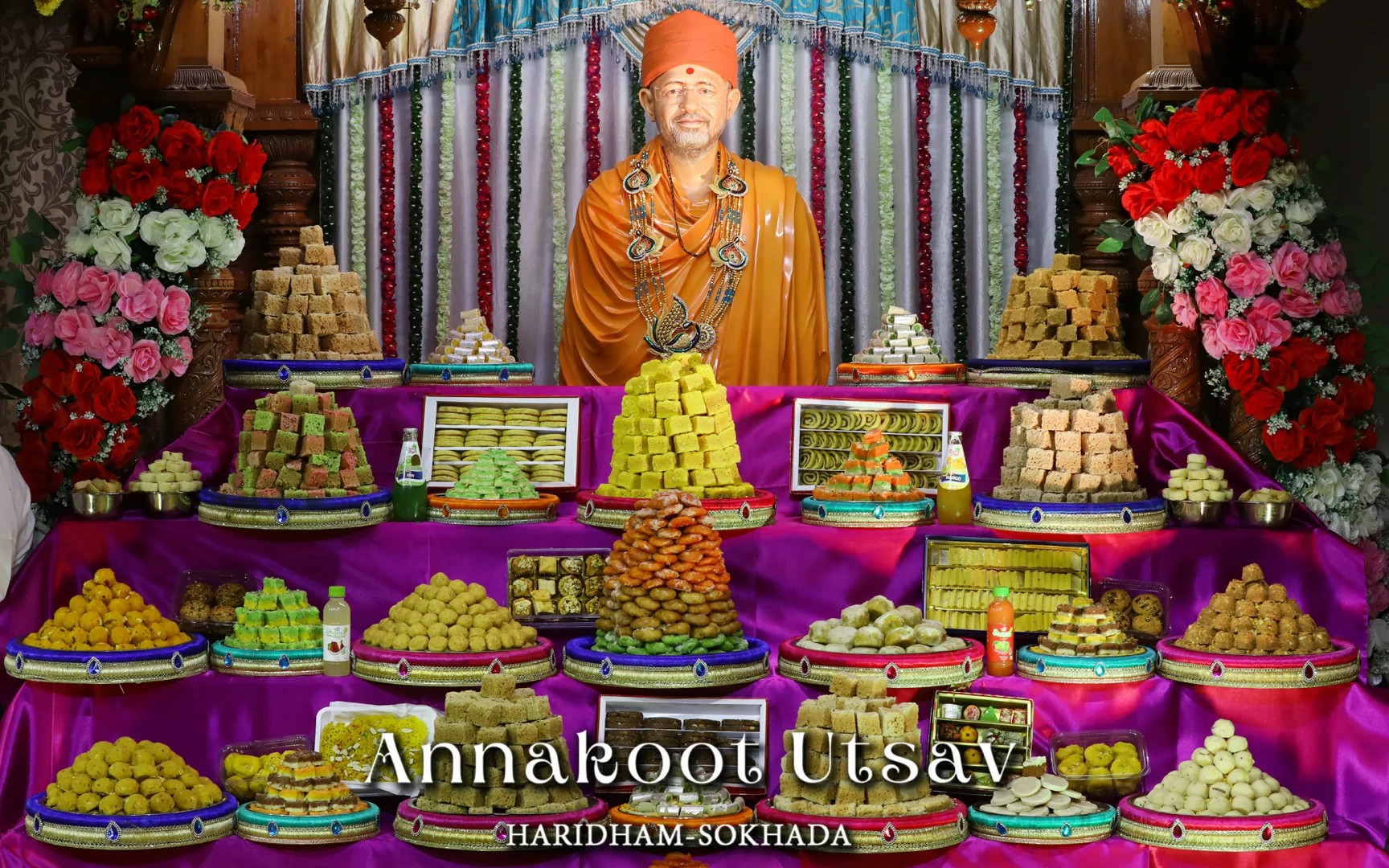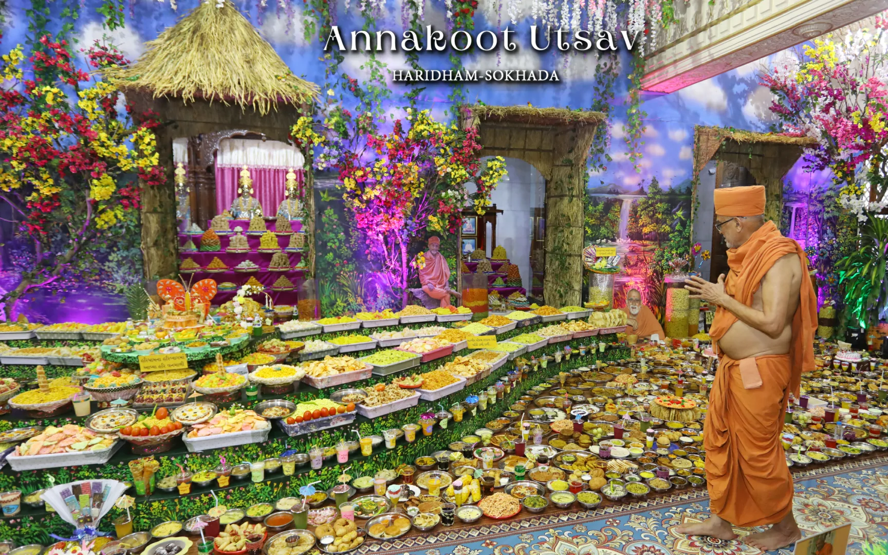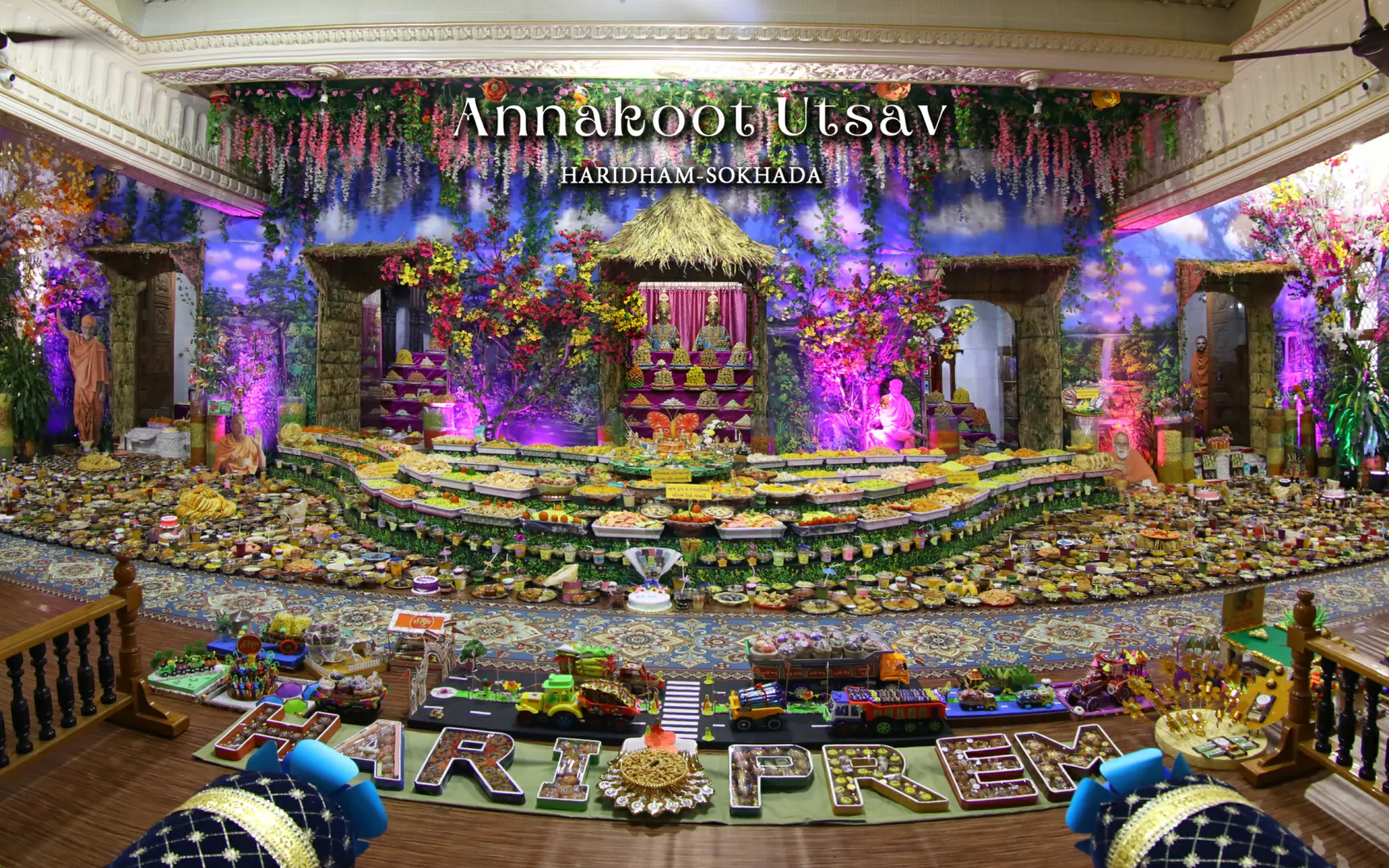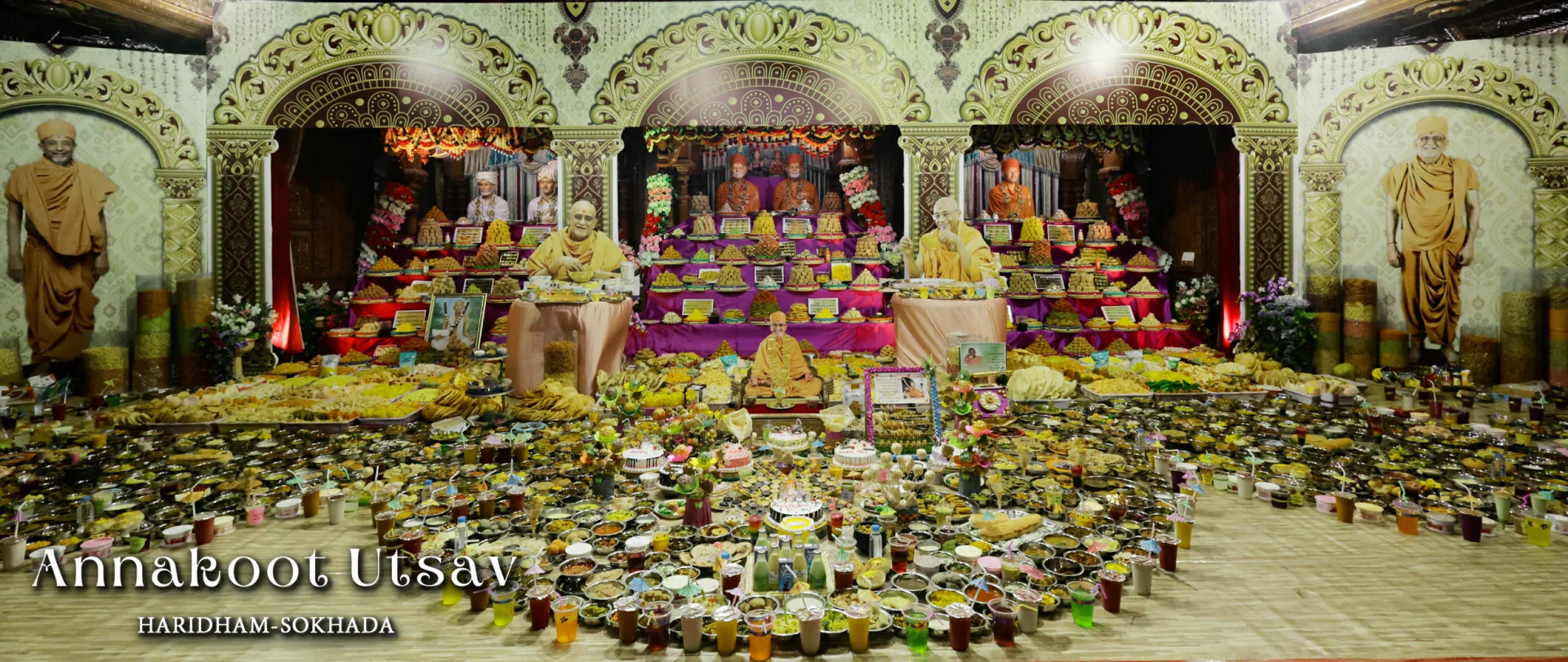 In HaridhamMandir very Large Annakoot of nearly 1500 items display is been arranged before every murti. Annakoot is the display of wide variety of foods in an attractive and artistic way. Over different varieties of food are decoratively arranged across feet wide. Sadhus, Sadhvis and dedicated devotees make these dishes early morning in Mandir. Very large no. of about 30,000 devotees every year come to participate celebration and for darshan of Annakoot and Prasad.