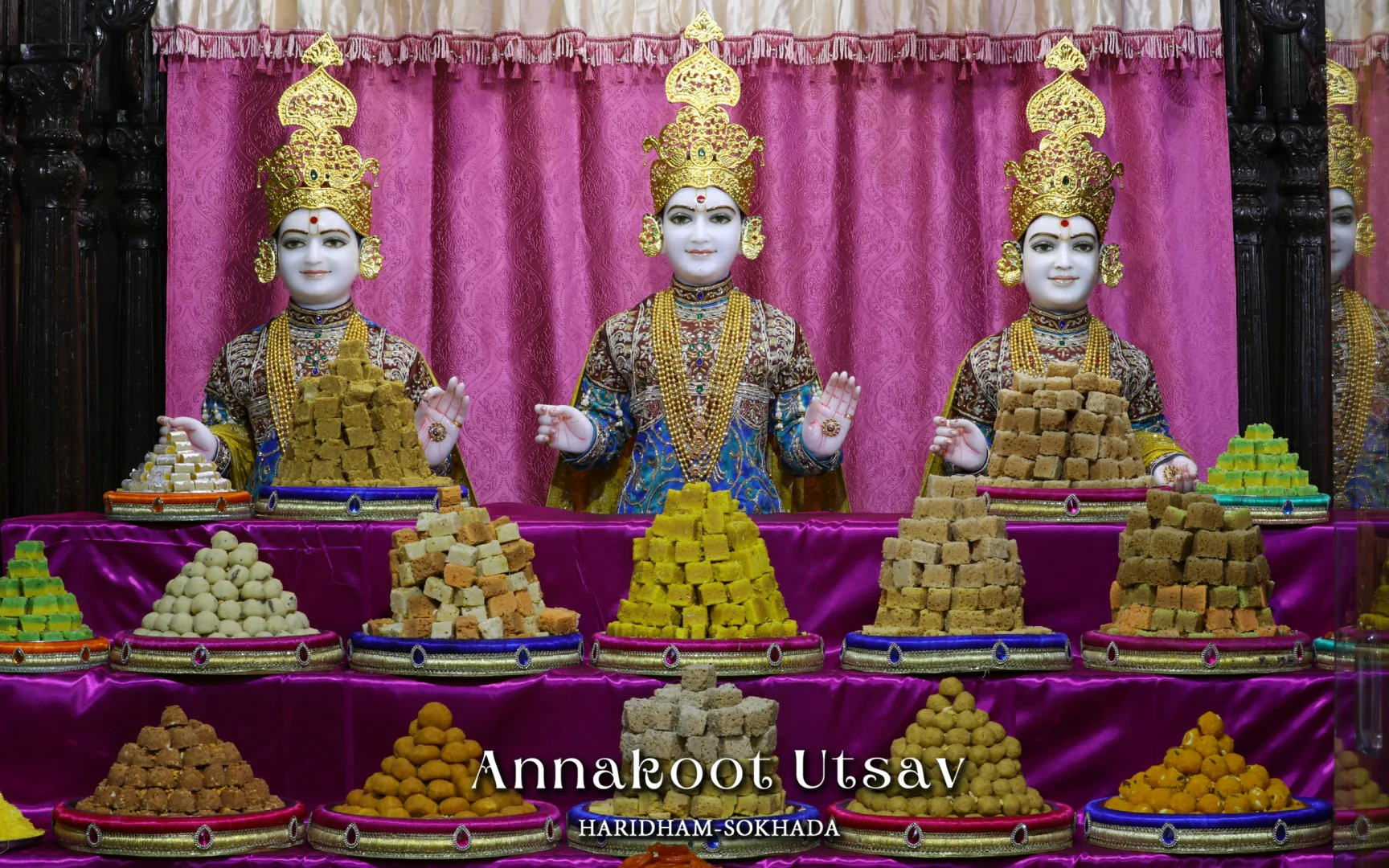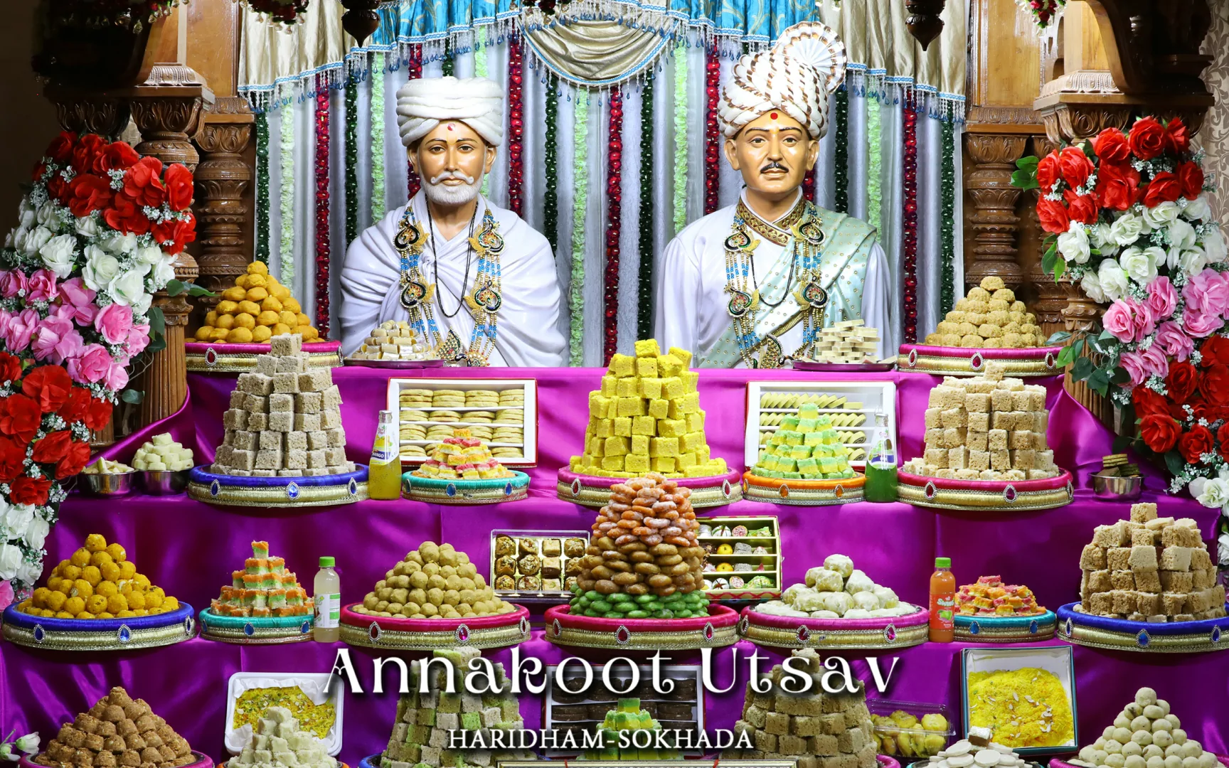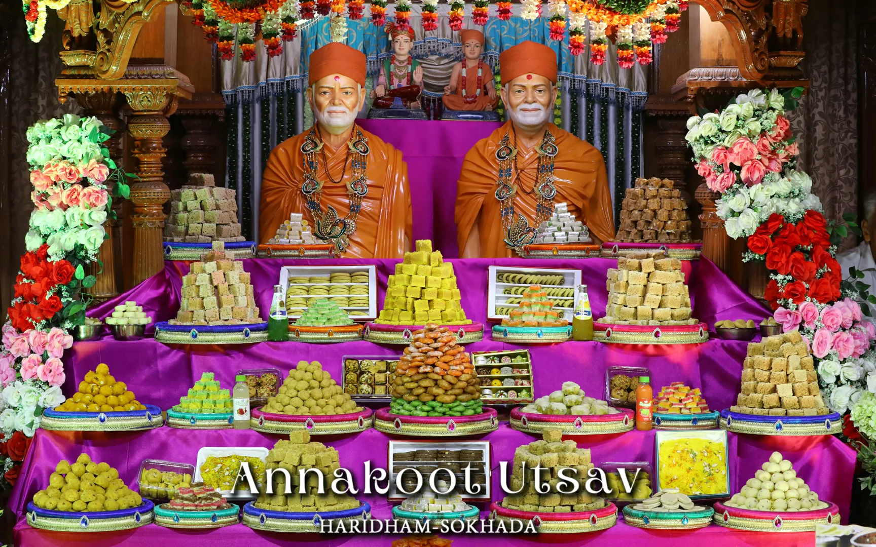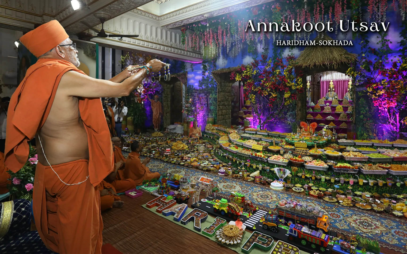 In HaridhamMandir very Large Annakoot of nearly 1500 items display is been arranged before every murti. Annakoot is the display of wide variety of foods in an attractive and artistic way. Over different varieties of food are decoratively arranged across feet wide. Sadhus, Sadhvis and dedicated devotees make these dishes early morning in Mandir. Very large no. of about 30,000 devotees every year come to participate celebration and for darshan of Annakoot and Prasad.