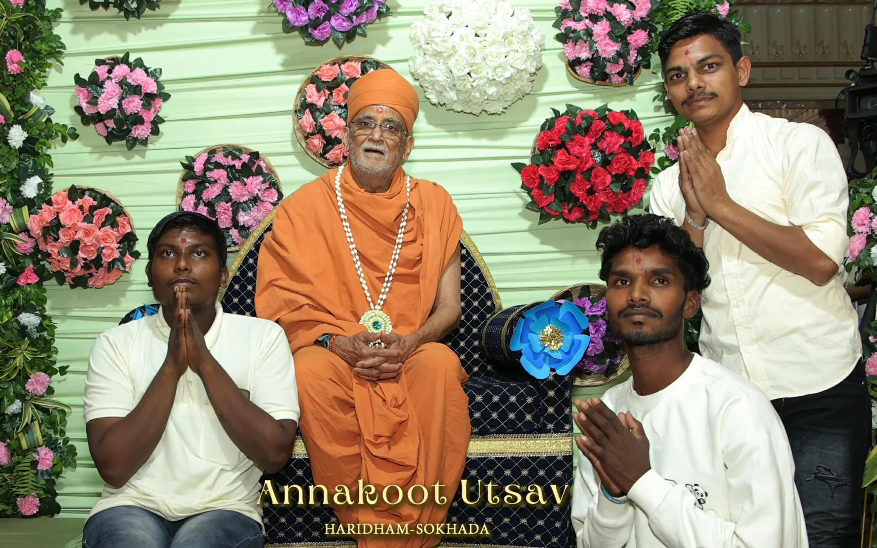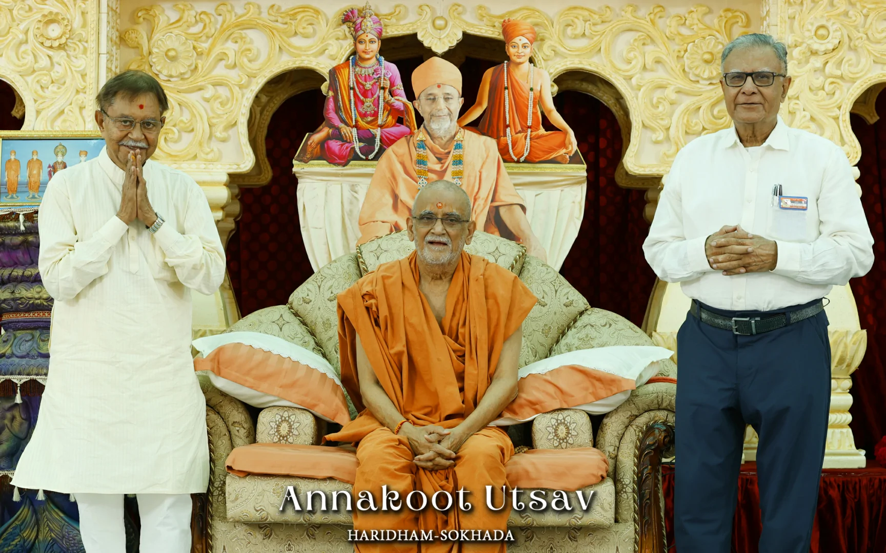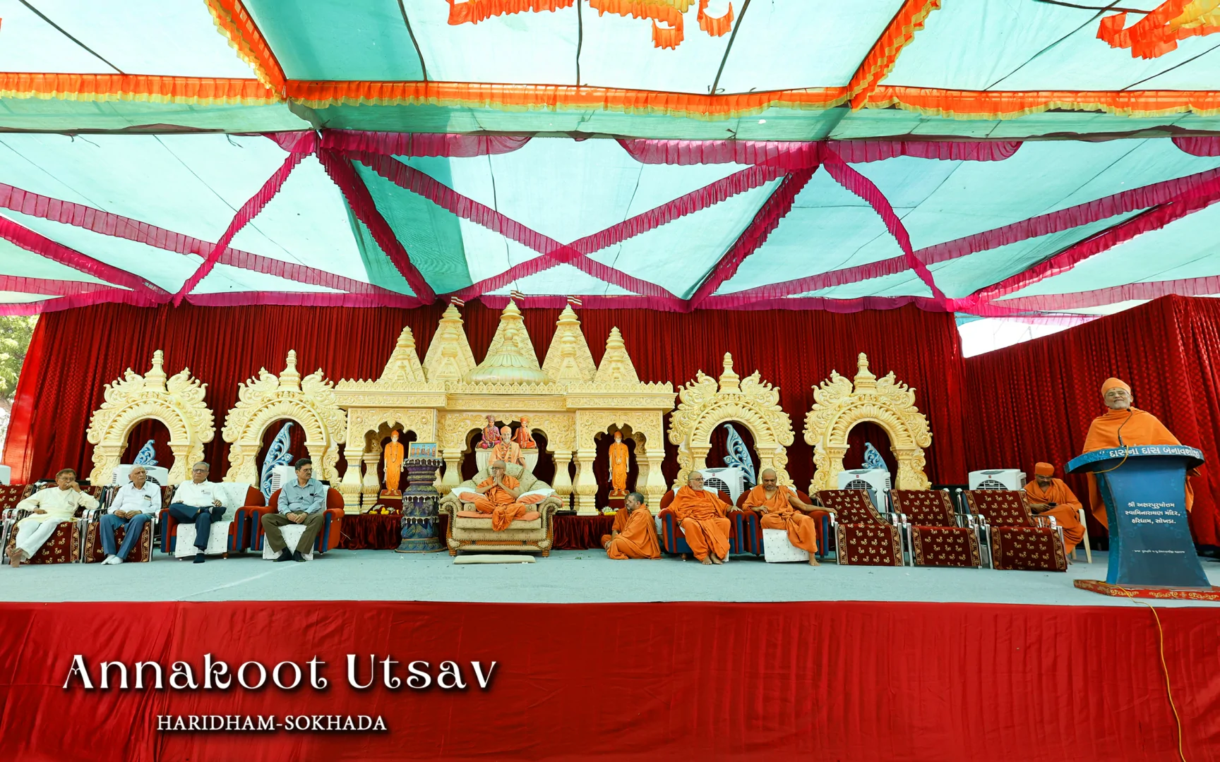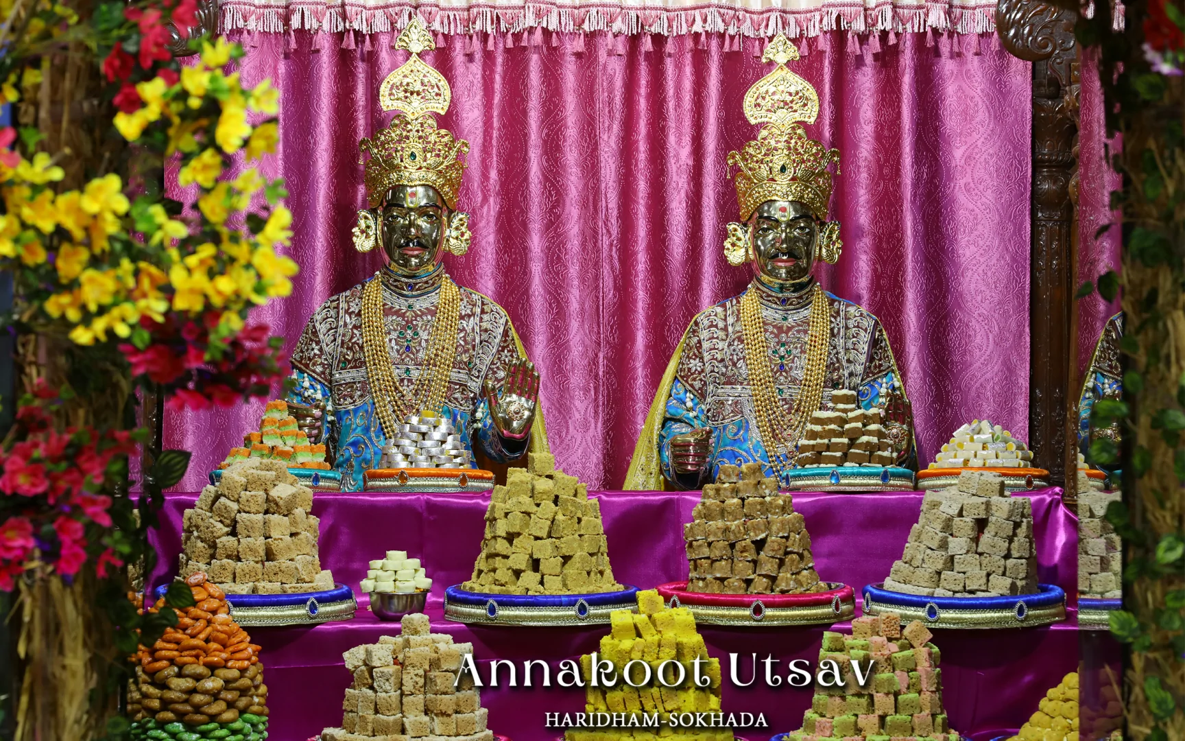 In HaridhamMandir very Large Annakoot of nearly 1500 items display is been arranged before every murti. Annakoot is the display of wide variety of foods in an attractive and artistic way. Over different varieties of food are decoratively arranged across feet wide. Sadhus, Sadhvis and dedicated devotees make these dishes early morning in Mandir. Very large no. of about 30,000 devotees every year come to participate celebration and for darshan of Annakoot and Prasad.